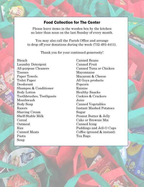 Donating food and personal items to The Center in Asbury Park is an ongoing ministry of the Church of St. Anselm. All donations are delivered to The Center on or just after the last Sunday of every month.