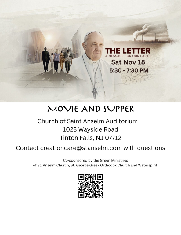 | Sat Nov 18 5:30-7:30: Movie Night and Supper Please join us for a screening of "The Letter” , produced by Oscar-winning Off the Fence Productions in collaboration with Laudato Si’ Movement and the Vatican, followed by discussion and light supper. The film brings to life the transformative vision of Laudato Si’, Pope Francis’ encyclical letter on the environment, to inspire lasting action for our common home. Middle and high school students are encouraged to attend with a parent. RSVP by Nov 16: https://tinyurl.com/11-18-23-THE-LETTER |